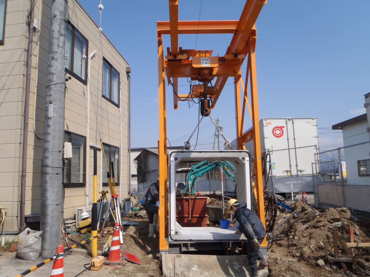 電柱移設後もクレーン施工が不可な箇所があり横引き搬送工法(ER工法)にて施工。